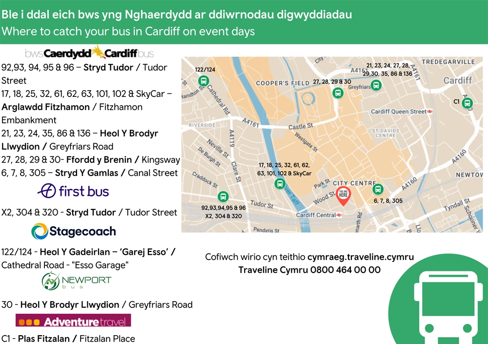 Ciw ar ôl y gêmBydd system ciwio yn weithredol yng ngorsaf Ganolog Caerdydd. Bydd nifer y teithwyr yn cael eu cyfyngu ar gyfer teithiau dwyffordd, byddwch yn amyneddgar. | |